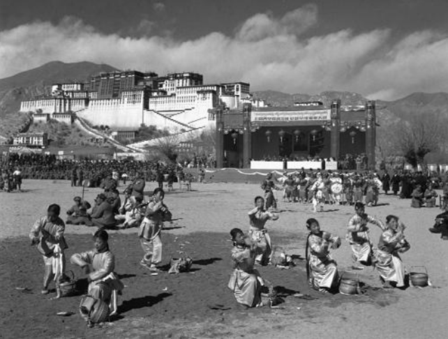 從青藏公路開到拉薩布達拉宮前的汽車隊,受到當地人民的夾道歡迎